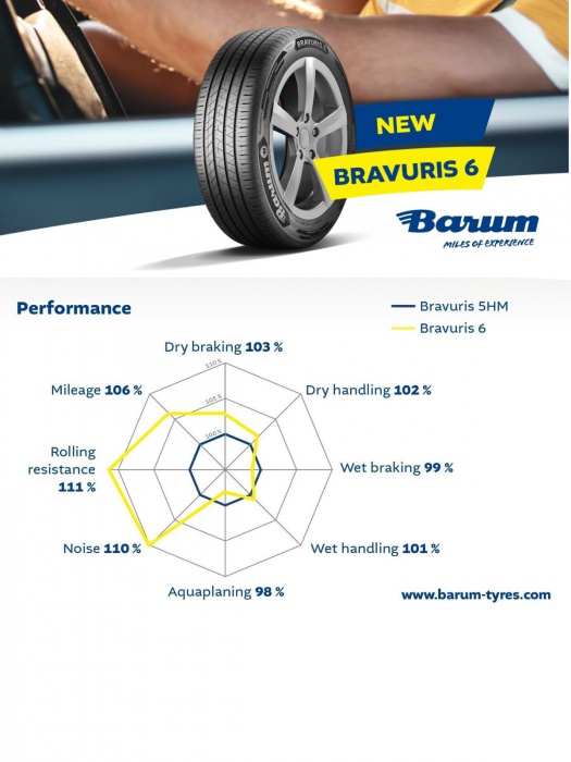 Barum Bravuris 6 je kvalitná a spoľahlivá letná pneumatika pre osobné vozidlá, poskytuje výborný výkon na suchých aj mokrých cestách, dlhú životnosť a nízky valivý odpor pre bezpečnú a komfortnú jazdu. Ponúka skvelý pomer ceny a kvality.